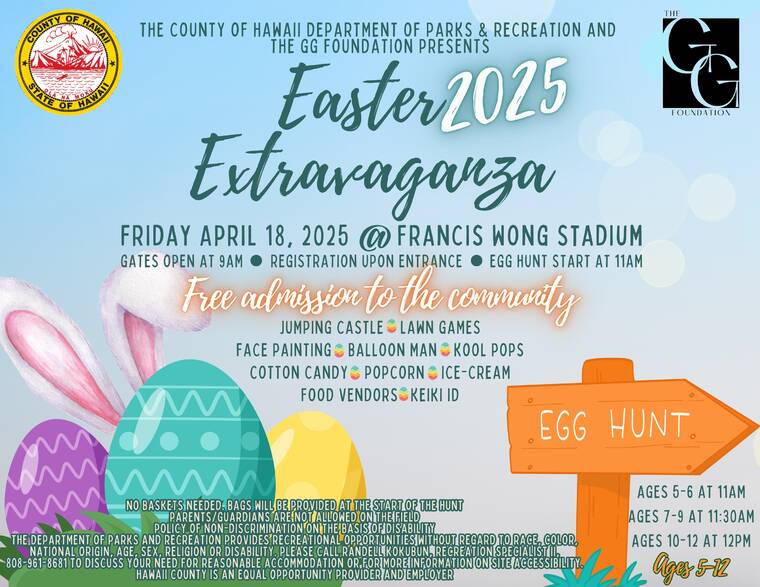 Hawaii County and its and community partners will host free Easter events Friday in Hilo and Pahala featuring egg hunts, games and more.