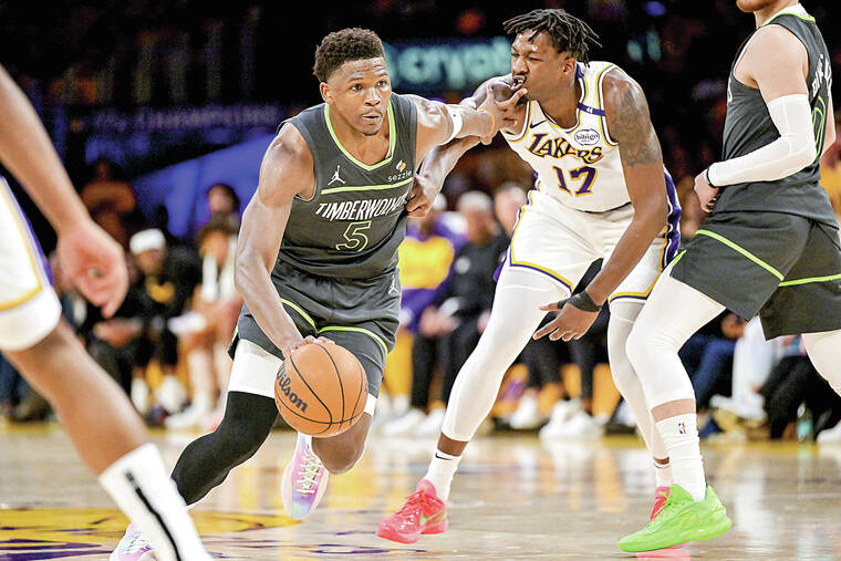 Jaden McDaniels collected 25 points with nine rebounds and Anthony Edwards added 22 points, eight rebounds and nine assists as the visiting Minnesota Timberwolves rolled to a 117-95 victory over the Los Angeles Lakers in the opener of a first-round Western Conference playoff series on Saturday.