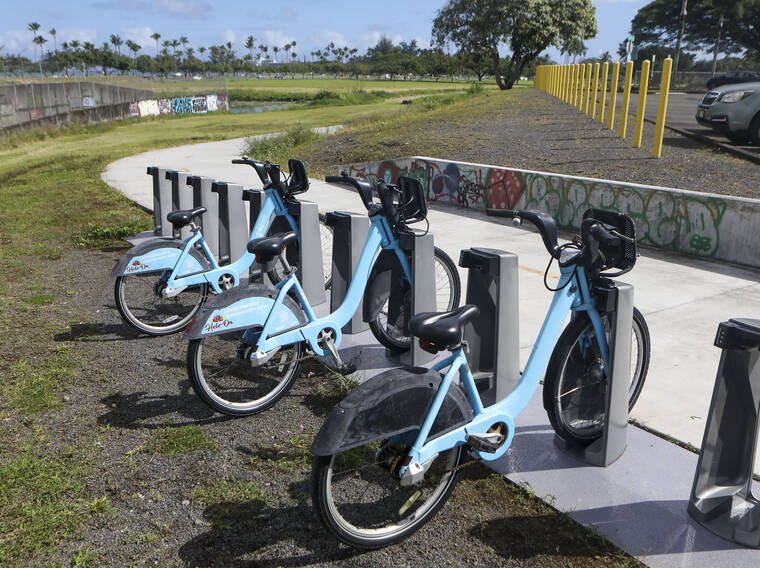 Tribune-Herald file photo A station for the HIBIKE bike-sharing system is shown in 2023 at the start of the Bayfront Trail near Ben Franklin Crafts in Hilo.