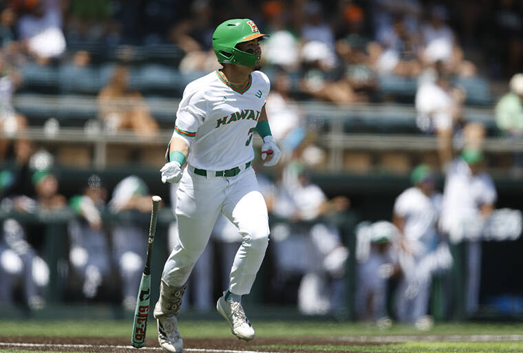 Hawaii shortstop Jordan Donahue (3) drops his bat after a grand slam home run during the third inning of a college baseball game against the UC San Diego Tritons on Sunday in Honolulu. Hawaii won 13-2 in its final home game of the season, and will play in the Big West tournament. (Jamm Aquino/Star-Advertiser)
