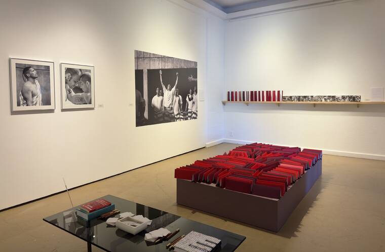 Photographs by Kai Markell and Kimberly Kamaluʻokeakua Moa demonstrate the impact of the Native Hawaiian Church, which has provided cultural resilience within the Hālawa Correctional Facility in recent years. The platform centered in the room has 173 reaffirmation notes written by incarcerated men and women, many of whom are fathers and mothers. These notes were born out of the Try Think Program piloted by Robert Chang at the Hawaii Council for the Humanities. The community is invited to participate in this immersive installation by writing notes back to those incarcerated.