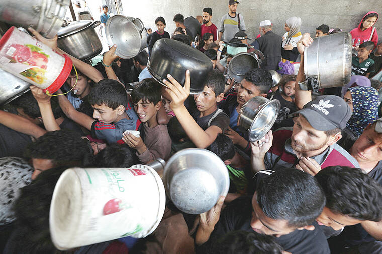 GAZA — Father of four Mahmoud al-Haw and other Palestinians crowd around a soup kitchen in war-ravaged Gaza, surging forward and frantically waving pots.