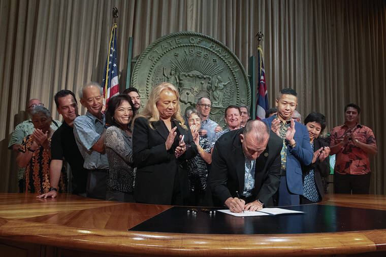 Gov. Josh Green signed Senate Bill 1396 into law as Act 96 on Tuesday while surrounded by representatives of Hawaii’s tourism and lodging industries who cheered on the new law, along with state legislators who navigated the bill through the legislative session that just ended.
