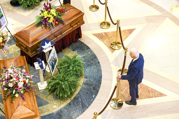 (His former vice president, Kamala Harris, was set to attend the Hortmans’ funeral service Saturday.)