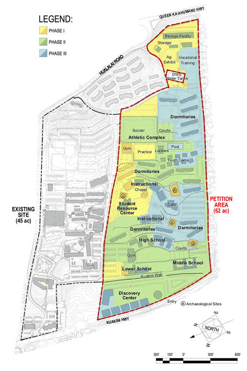 The master plan, if fully developed, would in three phases include additional student housing, academic instruction buildings, a student center, a lower school, athletic facilities, a chapel, maintenance and storage facilities, and supporting infrastructure which includes expansion of the existing central road, an additional secondary access point on Kuakini Highway, and necessary roadway improvements.