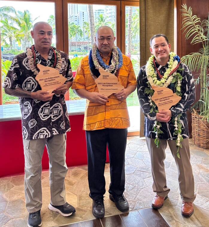 Three Hawaii Police Department recently were honored by Mothers Against Drunk Driving Hawaii and the state Department of Transportation for their efforts and dedication in the fight against drunken and drugged driving to reduce injuries and deaths on our island roadways.