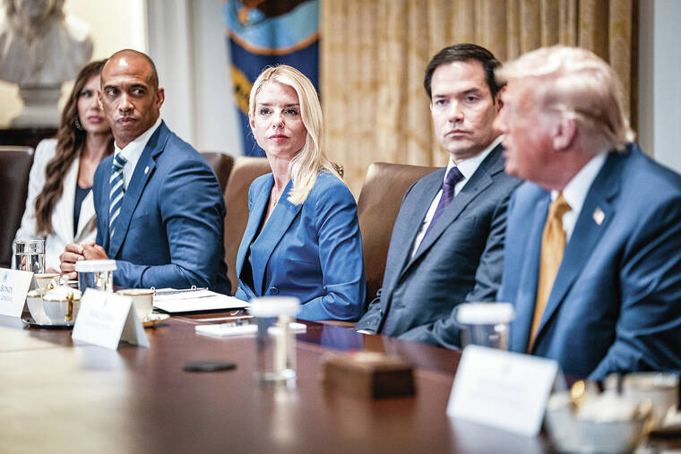 WASHINGTON — President Donald Trump on Saturday threw a political lifeline to Pam Bondi, his embattled attorney general, appearing to side with her over Dan Bongino, the FBI’s deputy director, who has threatened to quit over Bondi’s handling of the Jeffrey Epstein case.