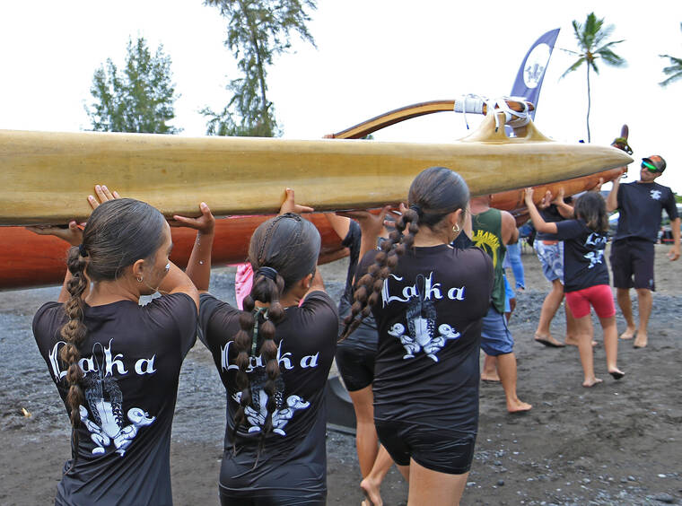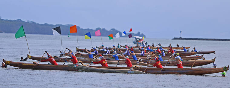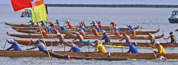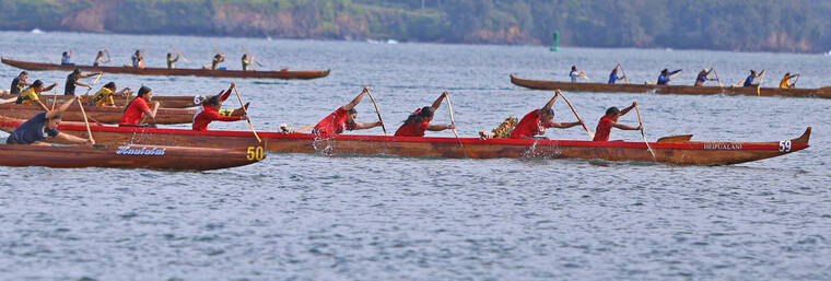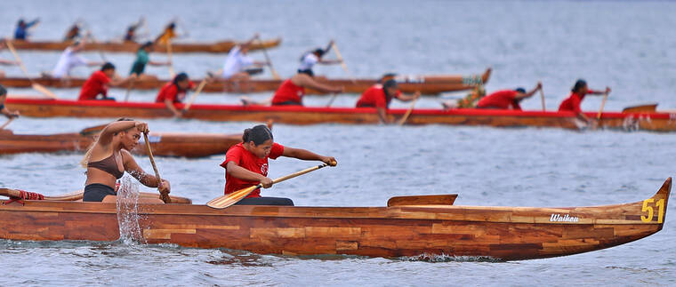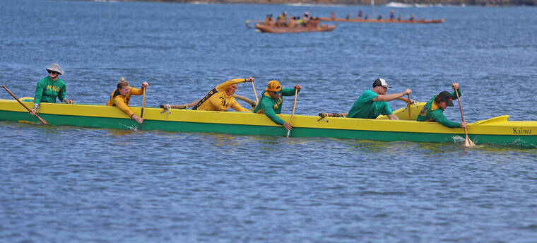 In the divisional races, Kawaihae finished with six gold medal wins, 11 silver and four bronze — tying Keaukaha with 21 medals. The club won the following divisional races — the boys 12 crew of Anaiah Akau, Aukanai‘i Akau, Makana Dela Cruz, Paul Griffin Jr, Nathan Ibrahim and Kayden Kauahi in the quarter-mile sprint (2:30.94); the mixed 12 crew of Kauahi, Pili Dayton-Smith, Lehiwa Lindsey, Tamryn Lorenzo-Akamu, Hana Maielua and Kaleb Takushi Jr. in the quarter-mile race (2:38.41); girls 13 quarter-mile crew of Riah Akima, Zoe Carpio-Napoleon, Kuili Livingston, Tehane Livingston, Lau‘ae Silva and Bella Sugse (2:27.36); girls 14 quarter-mile team of Hulili Ah Lo, Hali‘a Drummundo, Kaimahie Hooper, Maile Revilla, Lau’ae Silva and Sayuri Yamamoto (2:08.50); men’s novice crew of Chuck Clifford, Edison Dela Cruz, Keahi Esquerra, Jordon Lagaret, Josh Lai and Kukila Lincoln in the half-mile sprint (3:45.60); mixed masters 55 crew of Harold Alcoran, Tricia Bell, Ute Bouchez, Kehau Lincoln, Alton Oye and Jonathan Salvador in the half-mile bout (4:13.06).