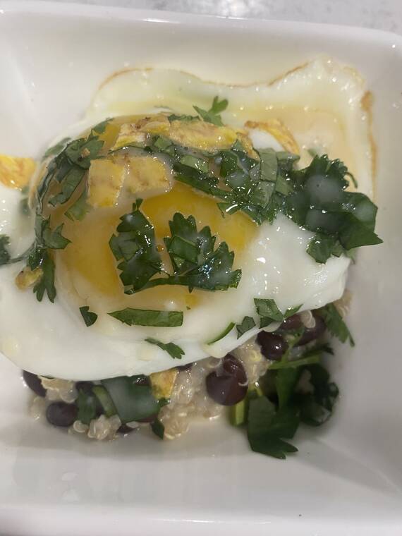 If you are a vegetarian, here are a couple of grain bowls that you may enjoy. Quinoa is a great source of protein, 8 grams, versus white rice, which has 4.3 grams; as well as carbohydrates, 39 grams versus 45 grams with white rice. Quinoa also has 5 grams of fiber versus 0.6 grams in white rice. Both are gluten free.