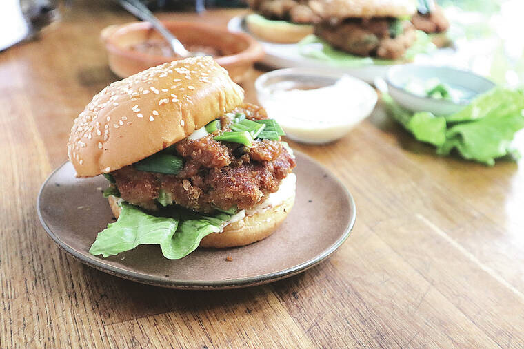 Assemble burgers: Spread the mayo generously on the bottom halves of the buns. Add a few leaves of lettuce, the patties and then the spicy sauce and zesty green onions.