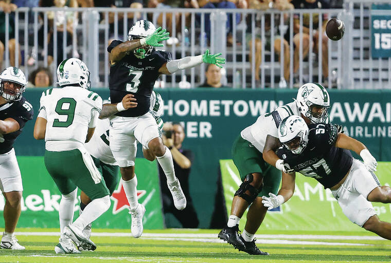 Weaver, who was a junior college All-American at Modesto College last year, completed 26 of 42 passes for 240 yards. And Matsuzawa remained perfect on 11 field-goal attempts this season, converting from 44, 47 and, with 58 seconds left, 35 yards. Matsuzawa accounted for all the UH points in the second half.