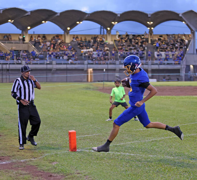 Hilo quarterback Austin Aguiar breaks the plane for a touchdown during Friday night’s game against Hawaii Prep Academy. The hosting Vikings cruised to a 42–3 win. (Tim Wright/newsphotoshawaii.com) ▲