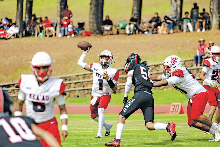 Kea‘au quarterback Trustin Gomes throws the ball during Saturday's win over HPA in Waimea. Gomes passed for a record nine touchdowns to go along with 452 yards. (Patrick O'Leary/Courtesy Image)