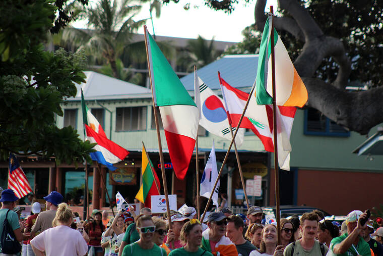 On Tuesday night, thousands of triathletes and their friends, coaches, families and supporters marched with their respective countries in the annual Parade of Nations along Ali‘i Drive. Parade-goers danced and cheered with joy as the excitement of the 2025 Ironman Women's World Championship awaits this Saturday. See our website for more images. (Conor Langs/West Hawaii Today) ▲