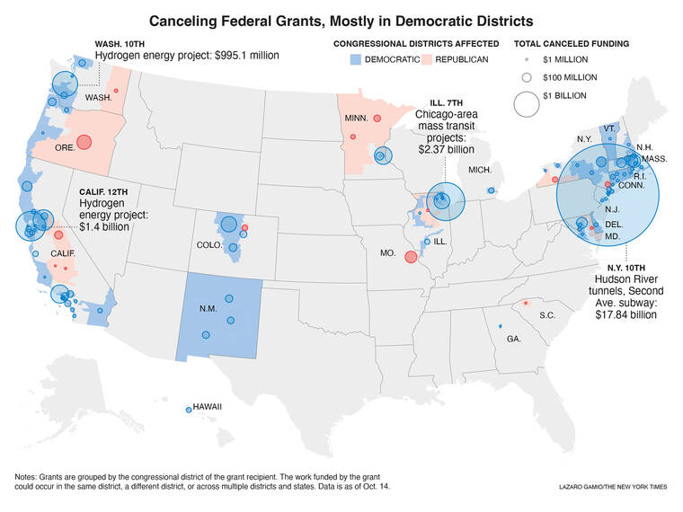 Two weeks into the government shutdown, the Trump administration has frozen or canceled nearly $28 billion that had been reserved for more than 200 projects primarily located in Democratic-led cities, congressional districts and states, according to an analysis by The New York Times.