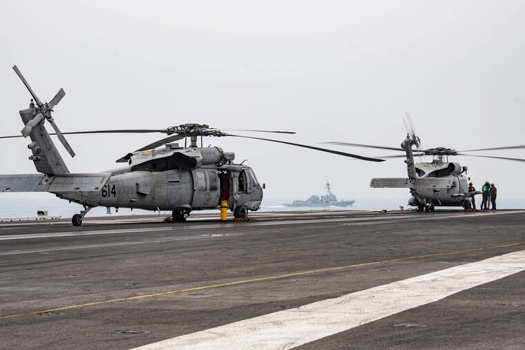 An F/A-18F Super Hornet fighter jet and a MH-60R Sea Hawk helicopter went down within half an hour of each other during operations from the USS Nimitz on Sunday afternoon, the U.S. Pacific Fleet said in a statement.