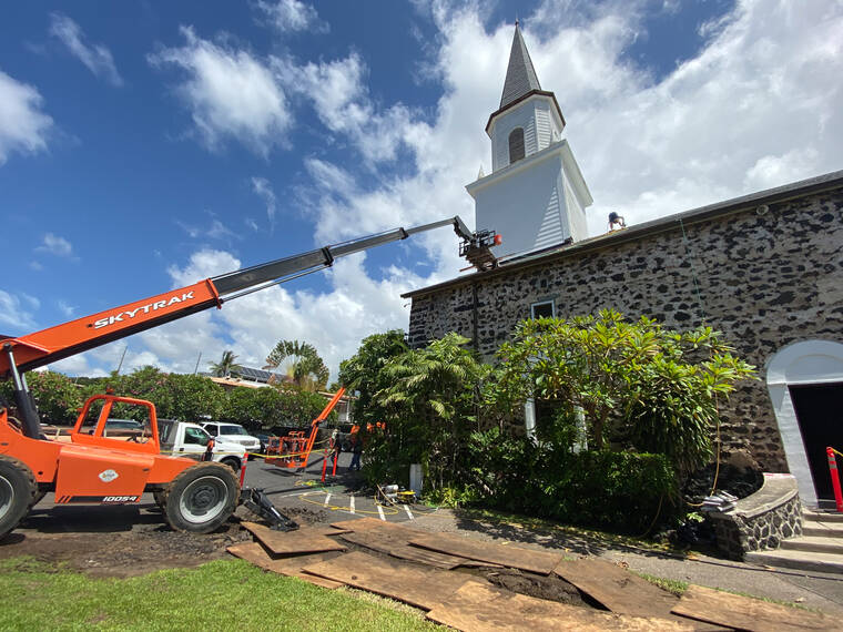 The historic lava rock and crushed-coral mortar structure with the 112-foot-tall steeple on Alii Drive was damaged in 2006 by a magnitude-6.7 earthquake on Oct. 15, 2006. The temblor, which is known as the Kiholo Bay Earthquake, cracked one of the church’s walls, but the congregation continued to worship in its sanctuary until termites caused church officials to call in an exterminator in 2019.