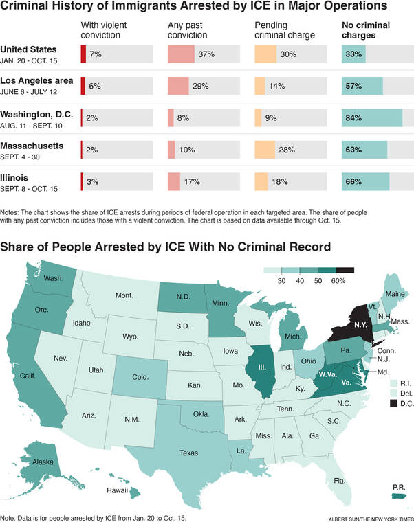 In high-profile Immigration and Customs Enforcement operations in Los Angeles; Chicago; Washington, D.C.; and across Massachusetts, more than half of those arrested had no criminal record, compared with a third of immigrants arrested nationwide.