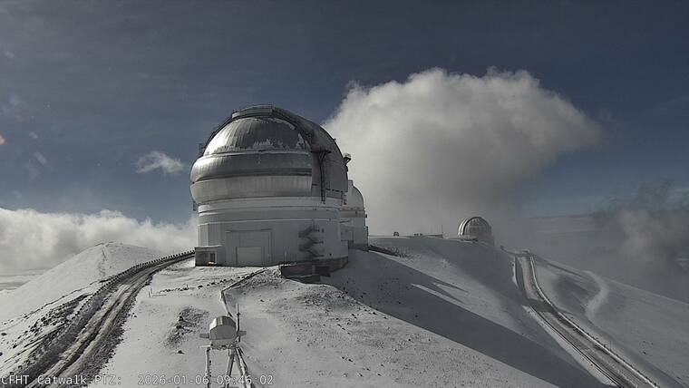 “Please stay away from observatory buildings, domes and other structures, as large ice fragments will be falling from above,” the recorded message on the Maunakea Rangers’ hot line cautioned summit visitors.