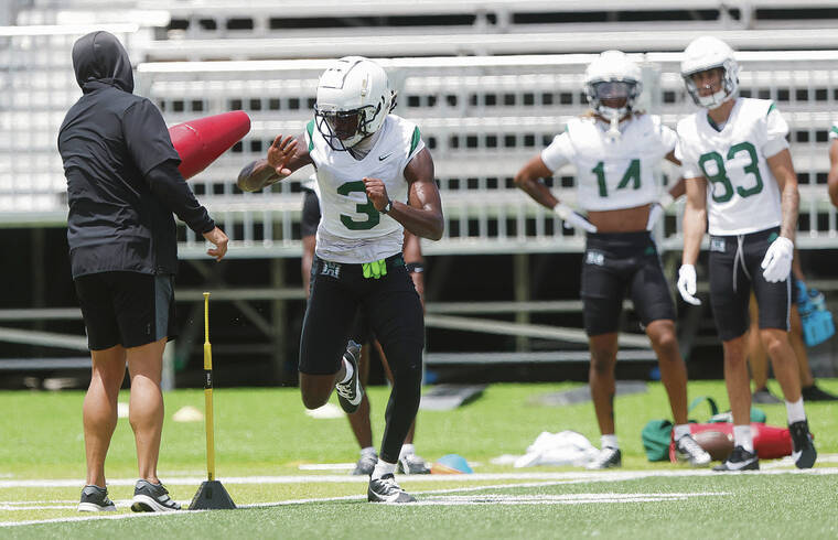 JAMM AQUINO/JAQUINO@STARADVERTISER.COM Hawaii wide receiver Nick Cenacle (3) goes through drills during the first day of fall football practice, Wednesday, July 23, 2025, at Ching Field in Honolulu.