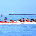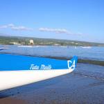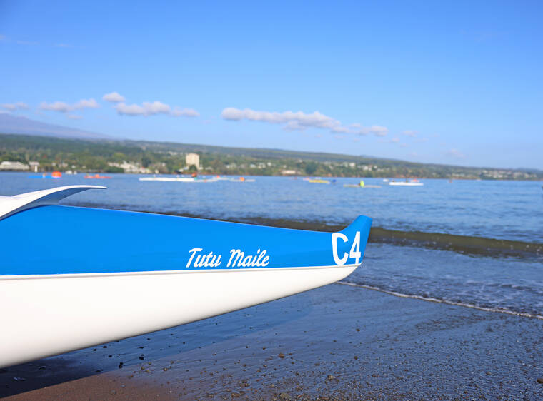 Girls from Waimea’s Kanu o Ka ʻAina Kipuka Charter School paddle to a tight victory during Saturday’s BIIF canoe races at Hilo Bay. (Tim Wright/newsphotoshawaii.com)