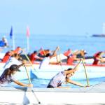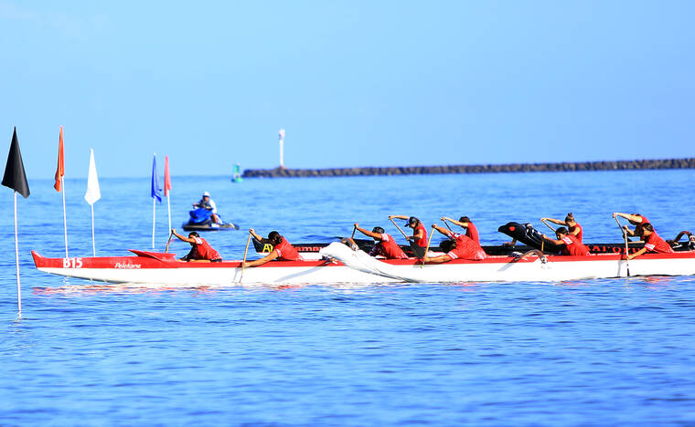 Parker School girls launch off the line during Saturday’s BIIF canoe races at Hilo Bay. (Tim Wright/newsphotoshawaii.com)