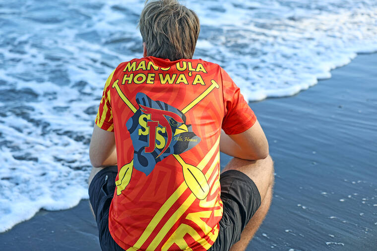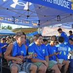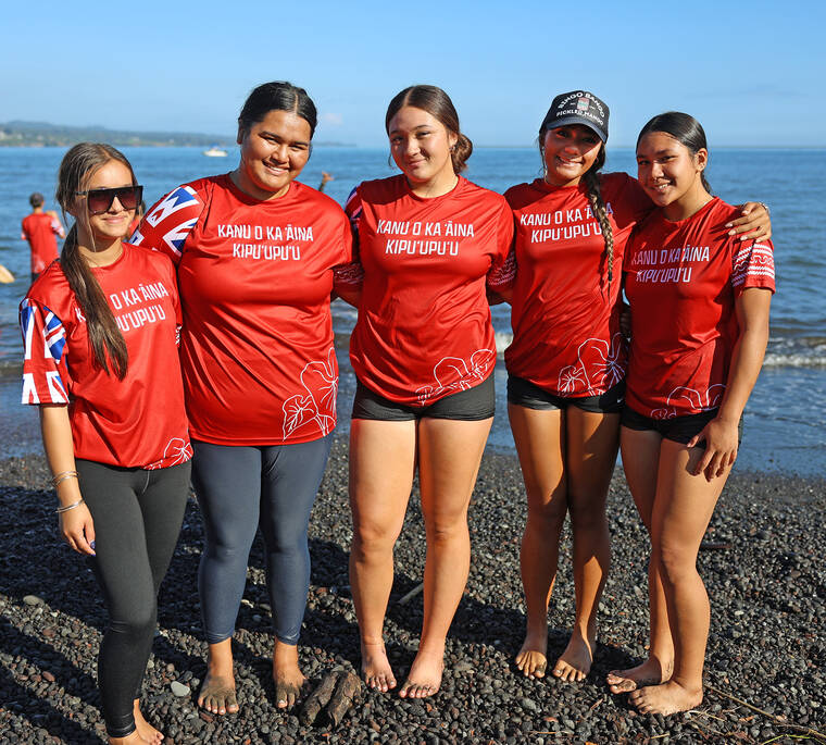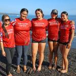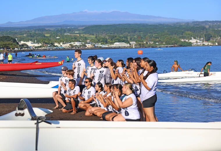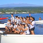 Team Waiakea pauses for a quick photo before heading out to paddle under blue skies and sunshine during Saturday’s BIIF canoe races at Hilo Bay. (Tim Wright/newsphotoshawaii.com)