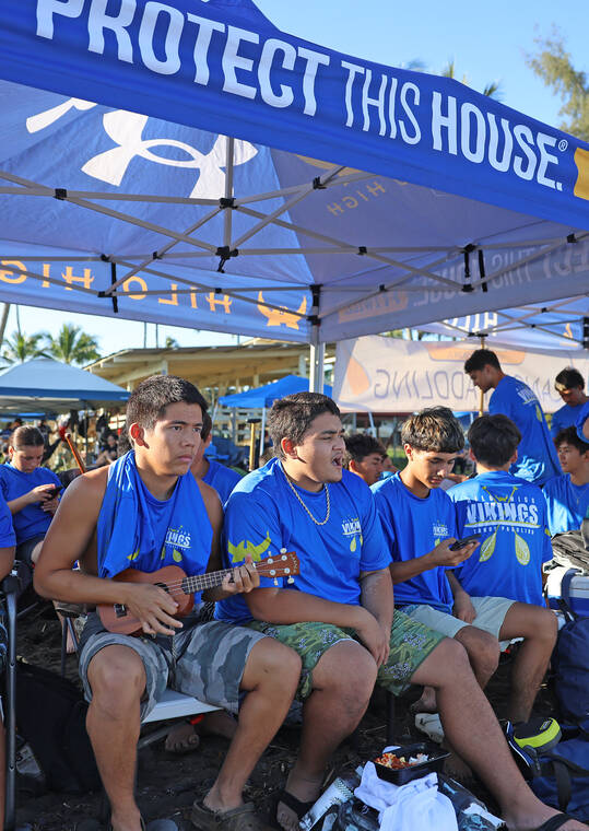 Hilo High paddlers pass the time by playing music and singing while waiting for races to begin during Saturday’s BIIF canoe competition. (Tim Wright/newsphotoshawaii.com