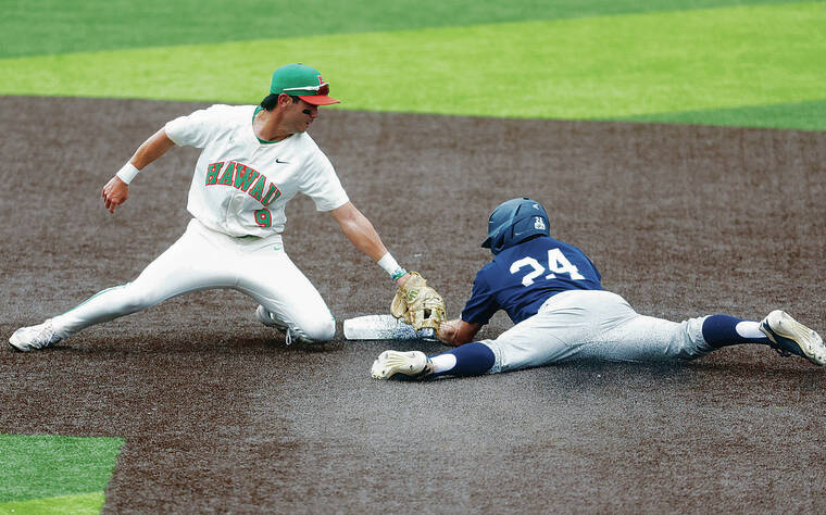 JAMM AQUINO / JAQUINO@STARADVERTISER.COM Hawaii’s Noah Rodriguez showed the ball to second base umpire Jason Venzon, left, after tagging UC Irvine’s Zach Doyle at second base during Sunday’s gameat Les Murakami Stadium.